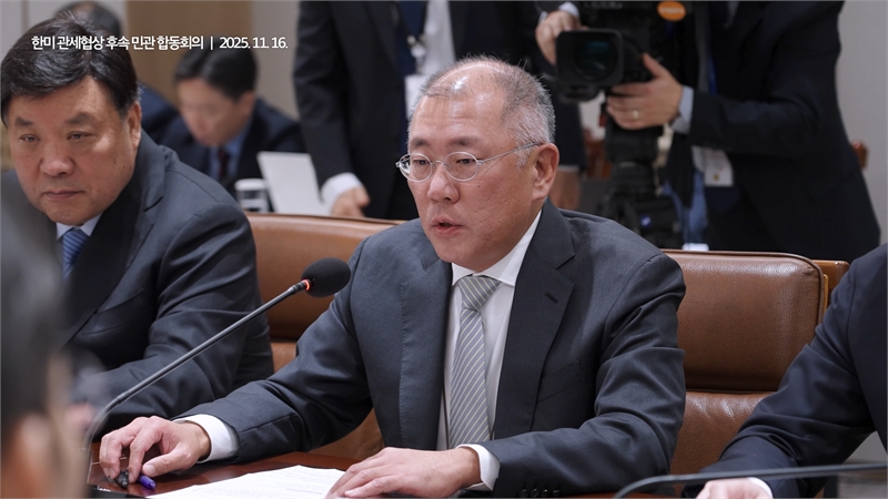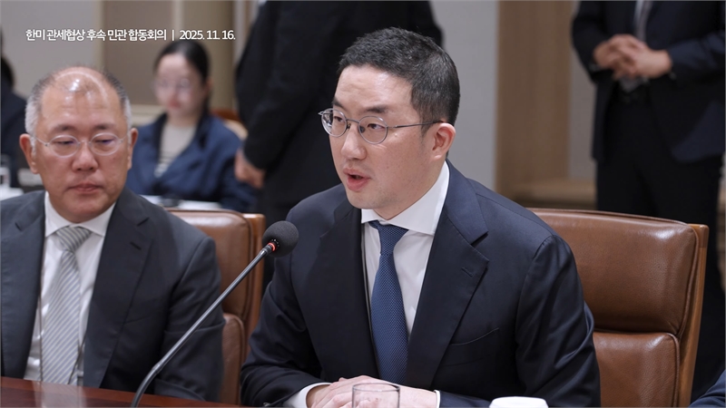 정의선 현대자동차그룹 회장은 “성공적인 APEC 개최와 한·미 협상 타결을 통해 글로벌 강국으로 도약할 기회를 마련해 주신 대통령님과 정부 관계자 여러분께 감사드립니다. 이번 관세 협상을 통해 현대자동차그룹이 경쟁력을 회복해 글로벌 전략을 더욱 적극적으로 추진할 수 있을 것으로 기대합니다”라고 말했다. [사진 = 이재명 유튜브]
