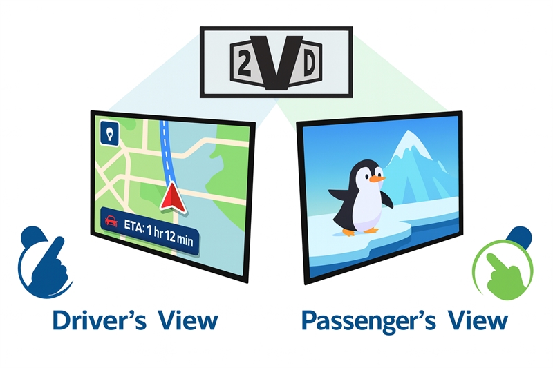 운전자가 내비게이션 화면을 터치하더라도 그 입력은 운전석 방향으로 송출되는 영상 신호에만 반영되며, 동승자 측 화면에는 영향을 주지 않는다. 패널은 하나이지만 화면과 입력 체계가 독립적으로 움직이도록 설계된 구조다.