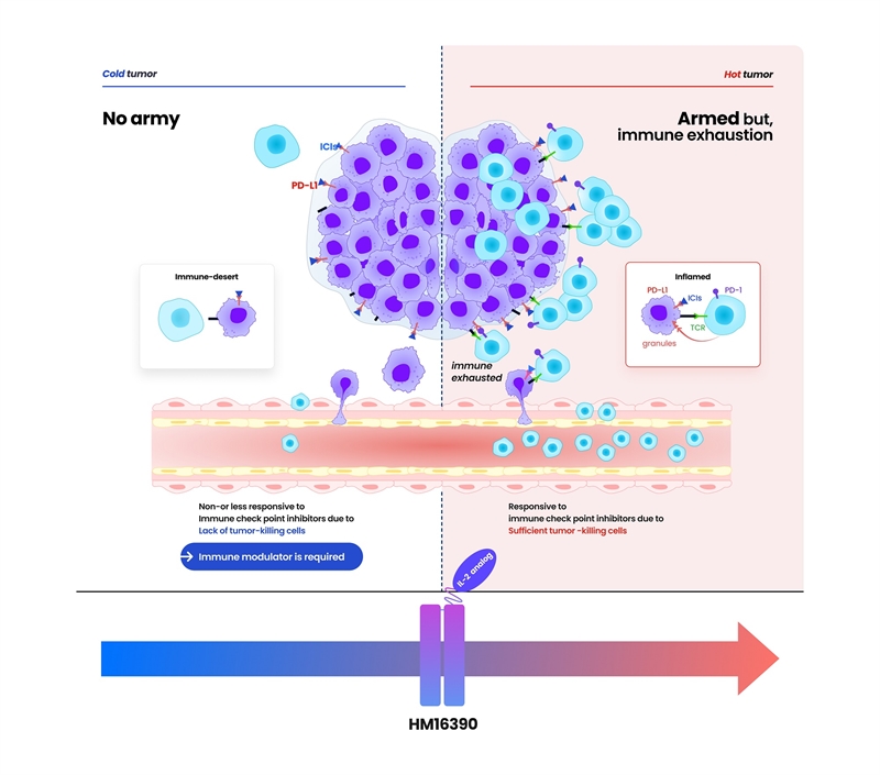HM16390의 작용 기전을 도식화한 이미지. 기존 면역세포가 부족한 ‘콜드 종양’을 면역반응이 활발한 ‘핫 종양’으로 전환해 항암 효과를 높이는 과정을 보여준다. 종양 주변에서 암을 공격하는 CD8+ T세포를 증가시키고, 면역 지침 신호인 PD-1 발현을 조절함으로써 면역항암제 반응성을 높이는 구조가 표현돼 있다. [사진 = 한미약품]