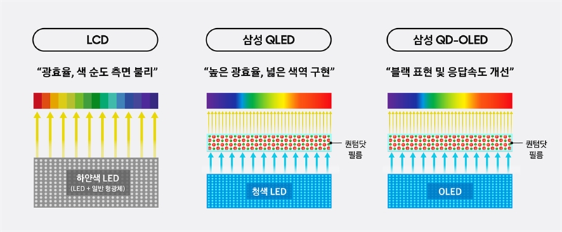 LCD와 삼성 QLED, 삼성 QD-OLED의 발광 구조를 비교한 개념도. [사진 = 삼성디스플레이]