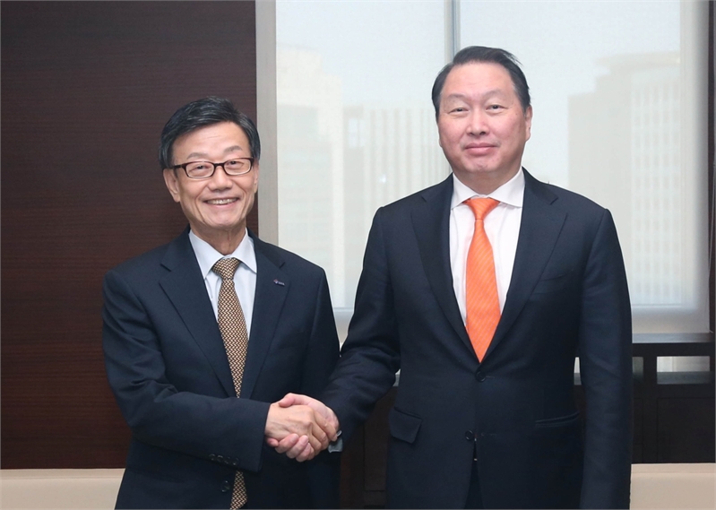 윤진식 한국무역협회 회장(왼쪽)과 최태원 대한상공회의소 회장이 서울 중구 대한상공회의소 회관에서 만나 악수를 나누고 있다. [사진 = 한국무역협회]
