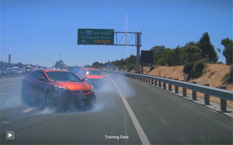 테슬라 FSD(완전자율주행) 학습을 위한 주행 시뮬레이션 화면. 연기와 급차선 변경 등 돌발 상황을 AI가 인식·판단하도록 학습시키는 장면이다. [사진 = 테슬라]