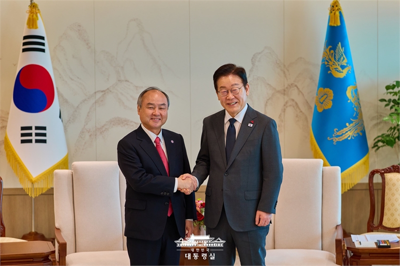 지난 5일 서울 용산 대통령실에서 이재명 대통령과 손정의 소프트뱅크그룹 회장이 만나 악수하고 있다. [사진 = 대통령실]