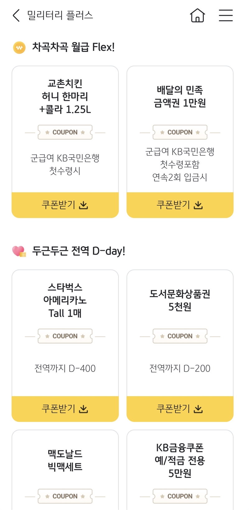 전역을 앞둔 병사를 위한 ‘두근두근 전역 D-Day!’ 혜택으로는 전역 D-400일 스타벅스 아메리카노 Tall 1매, D-200일 도서문화상품권 5000원, D-30일 맥도날드 빅맥 세트가 제공되며, 전역 시에는 KB금융 예·적금 전용 쿠폰 5만원이 지급된다.