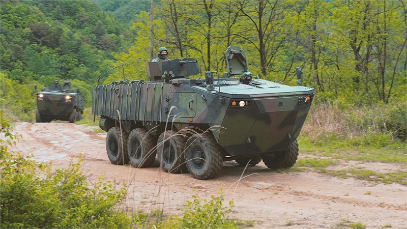 육군 훈련에서 기동 중인 K808 차륜형장갑차. K808은 산악·비포장 지형에서도 안정적인 주행이 가능하도록 설계된 8×8 구동 방식의 보병전투용 장갑차로, 이번 페루 수출 물량에 포함된 주요 기종이다. [사진 = 현대로템]