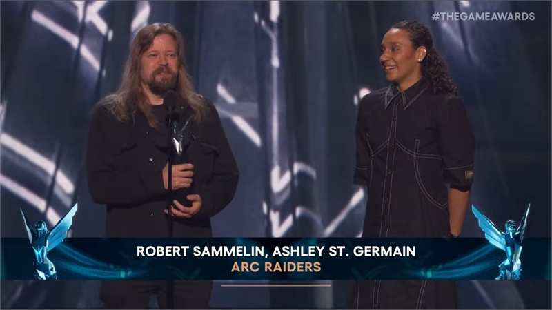 더 게임 어워드(TGA) 2025 시상식에서 ‘아크 레이더스’가 ‘최고의 멀티플레이어 게임’을 수상한 뒤 로버트 사멜린 엠바크 스튜디오 아트 디렉터(왼쪽)와 애슐리 세인트 저메인(Ashley St. Germain)이 수상 소감을 전하고 있다. [사진 = 더 게임 어워드 중계 화면 캡처]
