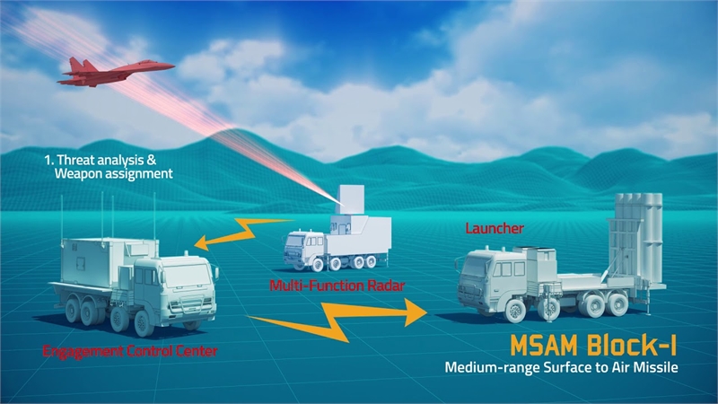중거리 지대공 유도무기체계(M-SAM·천궁) 운용 개념도. 다기능레이다(MFR)가 공중 표적을 탐지·추적하고, 교전통제소를 통해 발사대로 요격 명령이 전달되는 구조를 나타낸다. [자료 = LIG넥스원]